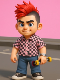 KTXX, 3D CGI illustration of a boy with a messy mohawk, wearing a bright red and black checkered shirt and blue jeans. He has a rebellious smirk and is holding a skateboard under his arm. The background is a neon pink color. The boy is standing on the sidewalk, ready to ride off. The style is reminiscent of modern, digital children's illustrations.