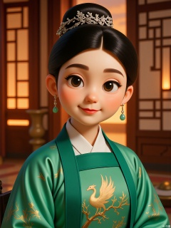 GFRW, A youthful Asian woman with jet-black hair in a sleek high bun, wearing emerald silk hanfu with gold phoenix embroidery, jade hairpin, silver filigree earrings. Soft gaze, blurred crimson lattice background, diffused golden hour light accentuating fabric textures.