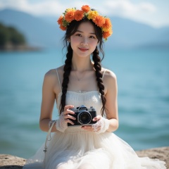 A young Asian woman with fair skin and loose braids of dark wavy hair. She was wearing a white sleeveless dress made of textured chiffon or sheer stiff yarn, giving a delicate and ethereal feeling. This dress has a high neckline and is decorated with a floral headpiece made of bright orange and yellow flowers, which contrasts sharply with her pale skin and dark hair. She was holding an old-fashioned camera in her hand, with a strap tied around her wrist and a delicate white lace glove on top. Her expression was soft and gentle, with a faint smile on her lips. She sat on a stone frame with a peaceful body of water in the background, possibly a lake or ocean. The water is deep blue, reflecting sunlight, and the distant horizon shows mountains under a clear blue sky. The overall atmosphere of the picture is peaceful and romantic, capturing moments of quiet contemplation by the water's edge. The composition and lighting emphasize the natural beauty of the subject and surrounding environment, creating a harmonious and picturesque scene.,<lora:S-T-唯美古风_S1.5:0.5>