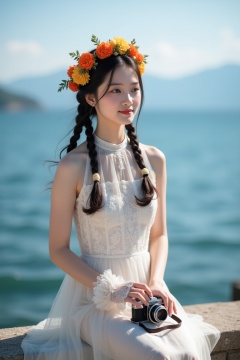 A young Asian woman with fair skin and loose braids of dark wavy hair. She was wearing a white sleeveless dress made of textured chiffon or sheer stiff yarn, giving a delicate and ethereal feeling. This dress has a high neckline and is decorated with a floral headpiece made of bright orange and yellow flowers, which contrasts sharply with her pale skin and dark hair. She was holding an old-fashioned camera in her hand, with a strap tied around her wrist and a delicate white lace glove on top. Her expression was soft and gentle, with a faint smile on her lips. She sat on a stone frame with a peaceful body of water in the background, possibly a lake or ocean. The water is deep blue, reflecting sunlight, and the distant horizon shows mountains under a clear blue sky. The overall atmosphere of the picture is peaceful and romantic, capturing moments of quiet contemplation by the water's edge. The composition and lighting emphasize the natural beauty of the subject and surrounding environment, creating a harmonious and picturesque scene.,<lora:S-T-唯美古风_S1.5:0.5>