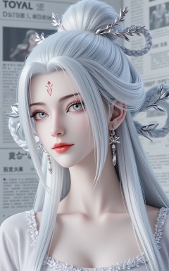 <lora:小白·发髻·衣服百搭款6:1.1>,xiaobai,1girl,solo,jewelry,earrings,white hair,hair ornament,long hair,facial mark,forehead mark,braid,red lips,closed mouth,makeup,grey eyes,hair rings,looking at viewer,cover,gradient background,close-up details,outstanding style,adding a touch of dimension to your images without compromising details,close-up,<lora:DJ滤镜_2.5D版:0.3>,lvjing,<lora:油画唯美滤镜15:0.2>,baoshi,<lora:报纸背景·5:0.4>,baozhi,paper,newspaper,the newspaper wall,newspaper background,