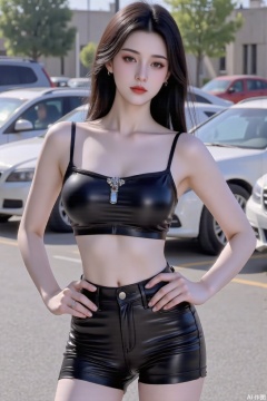 5 girl. She is standing with her body slightly turned to the side, with her hands on her hips and her head tilted slightly to the left. She has long dark hair styled in loose waves and is wearing a black crop top with a silver buckle on the front. The top is strapless and has a sweetheart neckline. The woman is also wearing a pair of black sequin shorts with a high-waisted fit. She appears to be confident and fashionable. The background shows a parking lot with cars parked in the distance..cy,yyzs,sw,mn,fgxp,xz,