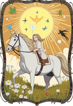 OKLP, A digital illustration of a "Sun" - themed tarot card art, featuring a child riding a white horse in a sunny meadow. Flowers bloom all around. They are surrounded by a frame with solar and floral patterns. The child has a bright smile and is wearing a simple, white tunic. The horse has a golden mane and tail. The background is a tapestry of tarot - style patterns of sunbeams, daisies, and butterflies. The artwork is done in a detailed, semi - realistic style with warm, vibrant colors and bright shading, symbolizing joy and vitality.