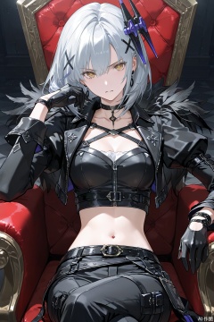 rosetta,white hair,short hair,yellow eyes,headgear,determined eyes,x hair ornaments,,gloves,black gloves,breasts,cropped jacket,looking at viewer,long sleeves,jacket,pants,black jacket,midriff,jewelry,belt,medium breasts,feathers,black pants,puffy sleeves,crop top,choker,earrings,navel,juliet sleeves,fur trim,open jacket,open clothes,facing viewer,sitting on throne,crossed legs,from above
