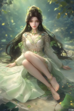 score_9,score_8_up,score_7_up,1girl,looking at viewer,solo,long hair,black hair,hair ornament,dress,jewelry,very long hair,green eyes,earrings,white dress,leaf,facial mark,nature,forehead mark,realistic,full body,lying,happiness,gem,toe ring,anklet,toes,barefoot,feet