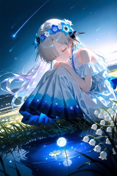 1girl,virtual youtuber,flower,solo,long hair,star (sky),closed eyes,isekai joucho,dress,field,head wreath,night,white flower,hair ornament,blue flower,multicolored hair,blue dress,sky,flower field,hair flower,starry sky,gradient dress,night sky,white hair,sitting,holding flower,knees up,flower wreath,holding,very long hair,bare shoulders,hair over one eye,grey hair,two-tone hair,blue hair,outdoors,on grass,on ground,bokeh,light particles,jewelry,off-shoulder dress,lens flare,ripples,off shoulder,glowing,knees to chest,daisy,two-tone dress,starry sky print,grass,smile,open mouth,earrings,full body,galaxy,squatting,sleeveless,blurry,depth of field,reflective water,blurry foreground,purple hair,long dress,closed mouth,alternate costume,white dress,dandelion,shooting star,purple dress,sleeveless dress,dutch angle,space,light,lily of the valley,own hands together,hands up,halter dress,wide shot,light smile,streaked hair,colored inner hair,reflection,hair between eyes,meadow,backlighting,blue theme,fireflies,hugging own legs,water,necklace,