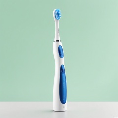 DSCP, Photograph of a state-of-the-art electric toothbrush, a white body with a blue bristle head, featuring multiple cleaning modes and a pressure sensor. The handle is slim and easy to grip. The background is a light mint green, creating a fresh and clean look. The design is modern and user-friendly. The lighting is focused, showing the toothbrush's details.