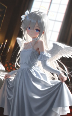 masterpiece,very aware,highres,absurdres,newest,best quality,loli,petite,high quality,chromatic_aberration,cinematic_angle,dutch angle, nyalia, //,artist:ciloranko,(artist:ningen_mame),(artist:sho_(sho_lwlw),(artist:rhasta),(artist:wlop),(artist:ke-ta)(hiten \(hitenkei\),//,1girl, solo, long hair, looking at viewer, blush, smile, bangs, blue eyes, hair ornament, dress, bow, bare shoulders, closed mouth, flower, ahoge, white hair, detached sleeves, wings, indoors, white dress, window, bed, white flower, feathered wings, angel wings, skirt hold, white wings, angel, candle, candlestand