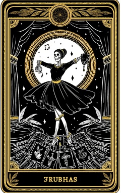 TLPF, A digital illustration in a gothic, vintage style featuring a skeletal dancer in a flowing, black tutu with gold sequins, twirling on a stage made of Tarot cards. The dancer is holding a mask in one hand and has a faint, musical note floating above her head. The background is a dimly lit, opera house with velvet curtains and a large, ornate chandelier. The Tarot card stage is decorated with images of art and creativity. The overall color scheme is dark with gold and black accents. The image is framed by a decorative border with musical note and feather designs.