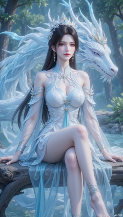 lvjing,1girl, dragon, jewelry, barefoot, dress, bare legs, white dress, long hair, black hair, clothing cutout, sitting, earrings, hair ornament, anklet, facial mark, feet, tree, shoulder cutout, forehead mark, tiara,18