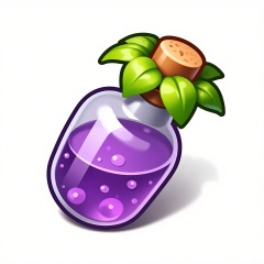 XTB, A digital illustration of a cartoon game icon of a potion bottle attached to a green leaf-shaped clip-on holder, against a plain white backdrop. The potion bottle is a deep purple color with a cork stopper, and it's bubbling slightly. The design is mystical and alchemical, with a potion-making aesthetic. The bottle is tilted, showing off the magical liquid inside. The leaf-shaped clip has a vibrant green color and veins that look realistic. The overall style is clean and modern, highlighting the wonder of magic.