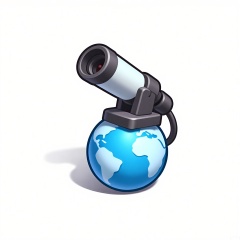 XTB, A digital illustration of a cartoon game icon of a telescope attached to a blue planet-shaped clip-on holder, placed on a white background. The telescope is a small, portable model with a lens that can be adjusted. The design is astronomical and curious, with a space exploration aesthetic. The telescope is pointed upwards, as if observing the stars. The planet-shaped clip has a blue and white color scheme, representing Earth, and a textured surface, adding realism. The overall style is clean and modern, emphasizing the wonder of the universe.