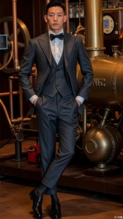Hyperrealistic, cinematic lighting. Central composition. A man in charcoal gray pinstripe suit with cropped peg-top trousers, black sheer socks with patent shoes, a loose black bowtie, leans against a brass steam engine. Spotlight precisely isolates the man, warm golden key light flows over the sheen of tights and suit fabric, background features blurred copper pipes, whirling gears, and neon-lit control panels. HD Masterpiece, capturing subtle intimacy and supreme textures..,jzns,brn,sheer socks,xnz,