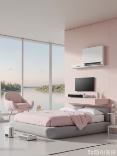 JDHB, A CGI render of a modern, minimalist bedroom with a large window overlooking a serene lake. The bedroom follows a soft pink and gray color theme, with a large sign stating "LAKESIDE LULLABY LL-500" above the bed. It includes a platform bed with a smart mattress that adjusts firmness, a wall-mounted TV, and a dresser with a built-in mirror. A small seating area with a pink armchair and a gray side table provides a place to unwind. The lighting is soft and romantic, creating a lakeside retreat feel.