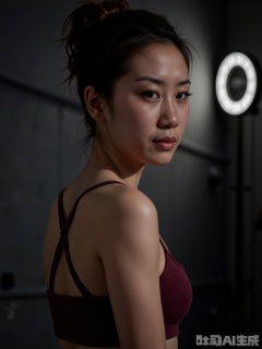 **People**: The high ponytail hairstyle is neat and crisp, and a black wide-edged sports headband is worn on the top of the head. Wearing a burgundy sports bra, the back of the bra is designed with cross-band straps to show sexiness and strength; a corner of the sports towel on the shoulder is cross-body. The makeup emphasizes the eyes, black eyeliner is paired with thick eyelashes, and rose red is used to enhance the aura. The expression is focused and has a hint of perseverance. The head is slightly sideways, and the eyes are sharp to the camera, interpreting the concentration and charm in movement.