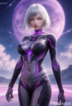 1girl, solo, breasts, looking at viewer, short hair, purple eyes, white hair, cowboy shot,cloud, lips, bodysuit, covered navel, glowing,skin tight, science fiction,