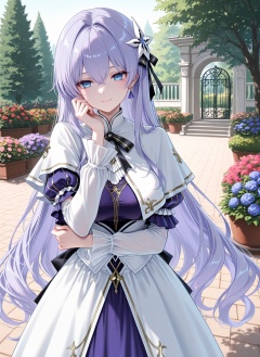 masterpiece,best quality,newest,absurdres,highres,soft shadows,year2024,mutou kurihito,(kimishima ao:0.7),(hiten \(hitenkei\):0.4),(sheya:0.4),<lora:Cantarella youngXLNAI:1>,Cantarella (\young\),1girl,light purple hair,blue eyes,hair ornament,hair between eyes,mole under eye,earrings,white capelet,puffy sleeves,long sleeves,purple dress,white dress,standing,outdoors,garden,hand on own cheek,smile,