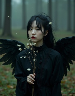 realistic portrait,film style,upper body,Aesthetics of material mourning,illusory and ethereal fairy with black wings,Gothic clothing,the background is the sacred symbol of ideal beauty that is about to disappear,translucent petals drifting with the wind,fluorescent raindrops like broken shadows,a little cold tone,natural hiding color method,complementary color coloring,hazy soft color,warm and glossy,frame composition,like dream,mystery,aestheticism,
