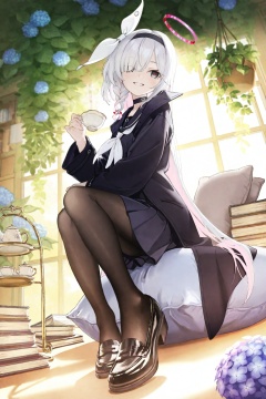 highres,absurdres,very awa,masterpiece,best quality,newest,year 2024,\n,<lora:BetterLine-Style:0.8>,\n,(plana \(blue archive\):1.3),blue archive,1girl,black eyes,grey eyes,hair over one eye,red pupils,white hair,pink hair,colored inner hair,very long hair,long hair,grey hair,two-tone hair,black hairband,single braid,hair ribbon,small breasts,black serafuku,black coat,black pantyhose,see-through pantyhose,shiny pantyhose,fine fabric emphasis,black shoes,\\//,(close up:1.6),(movie perspective:1.6),(dynamic pose:1.6),movie poster,from side,looking at another,1girl,solo,knitted sweater,messy bun,relaxed posture,\,curled up on cushion,holding teacup,smiling softly,cat napping on lap,\,sunlit conservatory,hanging ivy plants,vintage tea set,scattered books,blooming hydrangeas,\,golden hour glow,soft backlighting,steam from teacup,dust motes in sunlight,gentle highlights,\,intricate foliage details,shallow depth of field,filmic warmth,watercolor texture blend,