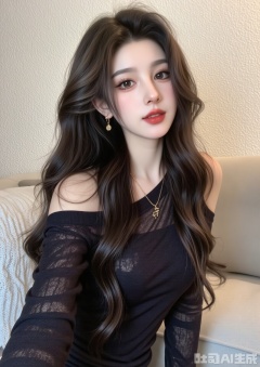 The image shows a person with long, wavy, dark brown hair, styled to one side. They are wearing a dark, off-the-shoulder top made of a mesh-like material. A delicate gold necklace with a small pendant is visible around their neck. The person is seated, and the background consists of a textured, light-colored wall and a light-colored couch. The overall setting appears to be indoors, likely in a living room or similar space.