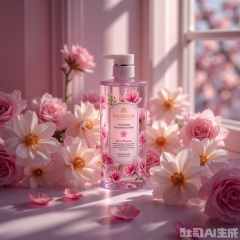 A masterpiece of photography style, high-end shampoo bottle, light luxury time, low-key quality, light mist, flowers, asymmetrical composition, blurred edges, light color light and dark changes, low light, multiple exposure, out-of-focus, ultra-wide Angle, strong perspective, shallow depth of field, high noise, strong film grain, diffusion and blurring, hazy aesthetics, surreal, vivid and perfect details, a masterpiece