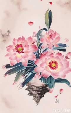 GBZS, A meticulous Chinese fine-brush decorative painting of blooming peonies, with layered, ruffled petals in shades of pink and red. The peonies are lush and full, set against a subtle, muted background that enhances their vibrancy. The painting follows traditional East Asian decorative techniques, with precise brushstrokes and gentle color transitions. The flowers are positioned in the upper right corner, cascading downwards gracefully. The overall composition is refined and harmonious, emphasizing floral elegance and grace.