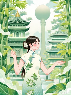 XSGC, Digital art of a dreamy bamboo grove scene with a young woman dancing among the stalks. She is dressed in an elegant white cheongsam with bamboo leaf patterns and a silver hair comb. The background reveals a hidden temple and a modern observatory, blending mysticism with science. The atmosphere is ethereal and graceful, with soft whites and greens. The woman is twirling lightly, holding a silk fan in her outstretched hand.