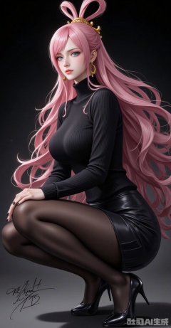 1girl,solo,pantyhose,high heels,looking at viewer,black footwear,squatting,sweater,quad tails,full body,parted lips,black sweater,earrings,signature,black nails,long sleeves,parted bangs,jewelry,pencil skirt,skirt,bangs,turtleneck,nail polish,black pantyhose,dress,(Black background:1.2),simple background,