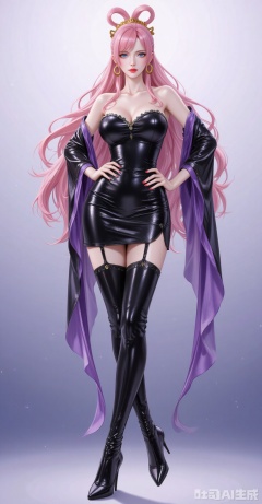 1girl,solo,dress,earrings,jewelry,black hair,boots,long hair,hand on own hip,thigh boots,full body,black footwear,latex,black dress,detached sleeves,bare shoulders,strapless,short dress,thighhighs,shiny clothes,looking at viewer,strapless dress,standing,hoop earrings,breasts,red lips,nail polish,high heels,leather,pencil dress,high heel boots,