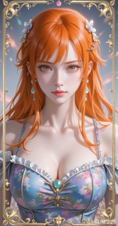 1girl,solo,earrings,jewelry,looking at viewer,breasts,tarot,collarbone,upper body,dress,closed mouth,card \(medium\),tarot \(medium\),frills,border,
