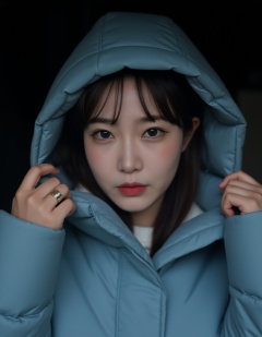 This is a photograph of a young Asian woman with fair skin, dark brown hair, and expressive eyes. She wears a light blue, puffy winter coat with a hood that she holds up with her left hand, revealing a gold ring on her ring finger. The background is dark, emphasizing her face and the texture of the coat. The image captures a sense of mystery and calm.