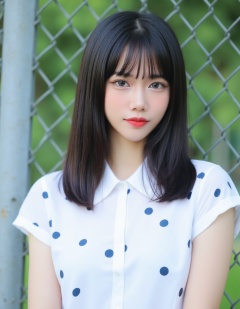 A photograph of a young East Asian woman with straight, long black hair and bangs, wearing a white short-sleeved shirt with blue and dark blue polka dots. She has fair skin, a slim build, and is standing in front of a metal chain-link fence, with greenery visible in the blurred background. Her expression is neutral, and she has a delicate, natural makeup look with red lipstick.