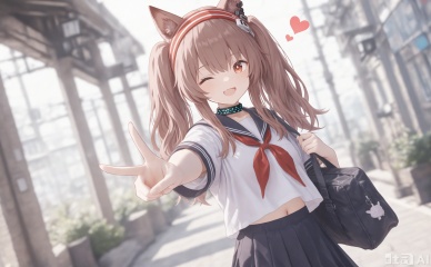 1girl, solo, long hair, looking at viewer, smile, open mouth, skirt, brown hair, shirt, red eyes, navel, animal ears, twintails, brown eyes, school uniform, white shirt, short sleeves, heart, cowboy shot, pleated skirt, hairband, one eye closed, serafuku, alternate costume, choker, fang, midriff, miniskirt, black skirt, sailor collar, bag, collar, neckerchief, fox ears, dutch angle, v, ;d, red neckerchief, black sailor collar, school bag, shoulder bag, red hairband, black collar, infection monitor \(arknights\), black bag, earpiece, angelina \(arknights\)
