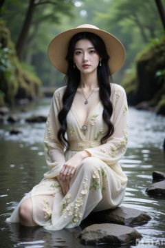 1girl, breasts, hat, jewelry, solo, black hair, earrings, water, dress, necklace, long hair, ring, braid, blurry, blurry background, outdoors, looking at viewer, nature, flower, sun hat, rock, see-through, brown eyes, sitting