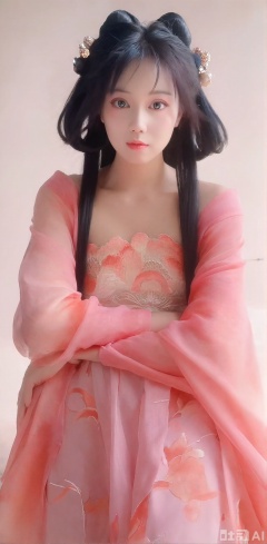 Ancient beauty, 3D game characters, surrealism, super clear human material feeling. Rich in color. High contrast, high color. , high-level sense, beautiful woman with high contrast, delicate facial features, mature, cold and cold, divine, fairy-like, movie-level light and shadow effect, super light and shadow atmosphere, big eyes, phoenix eyes. Exquisite makeup, shiny and charming. Delicate hair accessories with hair. Wear a pink long skirt with gradient peach branches and pattern, and a gradient pink silk cover is used to carry the arms. Take a full body image. The woman looks at the camera, with affectionate