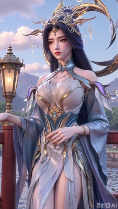 (masterpiece, best quality:1.2),1 girl, solo, long hair, black hair, hair accessories, clothing, cleavage cuts, long dress, jewelry, upper body, earrings. Background is outdoor, sky, clouds, water, trees, architecture, landscape, lantern, mountain, dragon, architecture, bridge, east Asian architecture, fog, pagoda,(huge breasts:2.99),(full breasts:2.99),Xaili2,XyunxiaoYH5,XlinziyueXZ,XtuliH,Xbigbreasts,XMedusaQueen,Xmiaozushaonv,Xkejinnvdi,Xbijinvshen