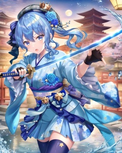Hoshimachi Suisei, holding a weapon with both hands, weapon on shoulder, 1girl, virtual youtuber, weapon, solo, blue hair, sword, blue eyes, gloves, kimono, japanese clothes, thighhighs, holding, hair ornament, obi, holding weapon, flower, open mouth, holding sword, sash, black gloves, star in eye, looking at viewer, katana, hair flower, side ponytail, floral print, blue kimono, star (symbol), wide sleeves, partially fingerless gloves, blue flower, bangs, rose, ribbon, crown, blue nails, water, symbol in eye, long sleeves, outdoors, architecture, hair ribbon, grey headwear, blue rose, beret, east asian architecture, hat, hair between eyes, long hair, fingerless gloves, print kimono, sky, medium hair, mini crown, plaid headwear, blue ribbon, blue thighhighs, frills, nail polish, purple thighhighs, :o, moon