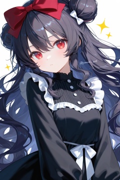 1girl,solo,long hair,looking at viewer,bangs,simple background,black hair,red eyes,long sleeves,white background,dress,bow,hair between eyes,very long hair,closed mouth,upper body,hair bow,frills,hair bun,twitter username,black dress,red bow,sparkle,wavy hair,white bow,