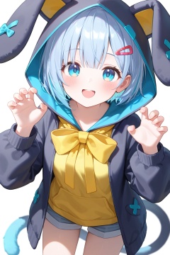 1girl, solo, looking at viewer, blush, smile, short hair, open mouth, blue eyes, hair ornament, long sleeves, white background, bow, animal ears, blue hair, tail, shorts, hairclip, hood, hoodie, animal hood, claw pose