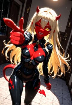 newtraumacore, 1girl, long blonde hair, red devil costume, small horns, tongue out, confident expression, winking, finger gun gesture, pointing at viewer, mischievous smile, tight outfit, tail slightly curled, background glowing red, playful pose, dynamic angle, bold shadows, dramatic lighting, stylish attitude, 3D Rendering, Beagle, Panorama, everyday scenes, vibes, storybook style, contemporary and historical influences, dynamic and flamboyant character designs, character art by Modern Disney, Pixar, cinematic, action