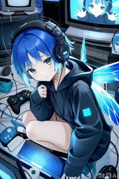 1girl, solo, short hair, bangs, blue eyes, long sleeves, blue hair, wings, shorts, hood, hoodie, headphones, controller, cable, computer, monitor, game controller, keyboard \(computer\),keki