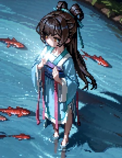 masterpiece,best quality,amazing quality,very aesthetic,absurdres,newest,(dino_(dinoartforame):0.3),(yoneyama mai:0.7),(quasarcake:0.5),from_above,1girl,gui_zhong,hanfu,standing by the river,there are many fish in the river,bright light and shadow,transparent river water,willows,