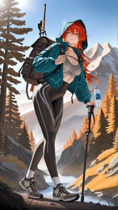 masterpiece,best quality,amazing quality,<lora:augusta-000025:0.8>,1girl,red eyes,red hair,augusta \(wuthering waves\),<lora:20250808-1754650692631:0.8>,zhigan3d,1girl,solo,outdoor_sport_style,sky_blue_waterproof_jacket,hood_up,black_high_waisted_leggings,gray_sports_bra (visible at neckline),hiking_shoes,thick_hiking_socks,hiking_backpack,holding_walking_stick,walking_on_dirt_trail,suburban_hiking_path,pine_trees,rocky_outcrops,distant_mountain,morning_sunlight,fresh_air,sweat (subtle),backpack_water_bottle,