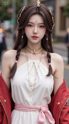 1girl,solo,jewelry,flower,hair flower,hair ornament,necklace,realistic,brown eyes,looking at viewer,dress,blurry background,twin braids,blurry,white dress,long hair,upper body,breasts,pink bow,red jacket,bare shoulders,lips,collarbone,outdoors,cleavage,large natural breast,soft breasts,huge Breasts