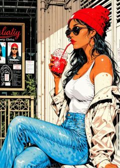 masterpiece, best quality, amazing quality, (*****, aged up,:1.1) realistic,  semi realism,Purpl3sk3tch, 1girl, hoop earrings, solo, sunglasses, hat, earrings, long hair, jewelry, black hair, beanie, sitting, pants, jeans, denim, jacket, drinking straw, **** top, cup, red headwear, tan, drinking, holding, from side, flat colors, stylish, accurate, immaculate anatomy,  detailed background, <lora:Purple_Sketchbook:0.3> <lora:LORA-64-dmd2:1>