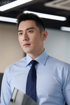 一位神情专注、目光睿智的男士,身着笔挺的淡蓝色商务衬衫搭配深色领带,彰显专业气质。整体风格偏向现代都市职场风。光线运用顶光,模拟办公室吊灯效果,在面部形成自然阴影,增添立体感,同时在下方布置反光板补充面部光线。渲染注重呈现衬衫的平整质感与领带的光泽。色彩以淡蓝、深蓝和米白为主,展现清爽与沉稳。构图采用中心构图,将人物置于画面中心,身后搭配简洁的办公场景,强化主题。视角选择微微仰拍,突出男士的自信气场。摄影参数设定为光圈f/4,快门速度1/160 秒,ISO 200,保证画面清晰锐利。