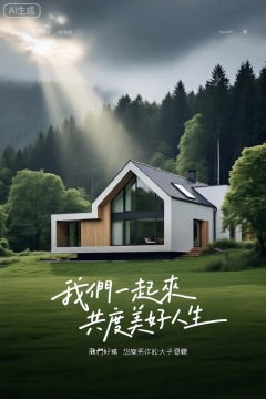 现代化简约房屋坐落于葱郁绿野,大窗斜顶尽显时尚。屋后茂密森林,高大树木林立。阴沉天空中一道阳光穿透云层,洒下柔和光芒。画面上有中文“我們一起來共度美好人生”,整体氛围宁静宜人,传递和谐欢乐之感。