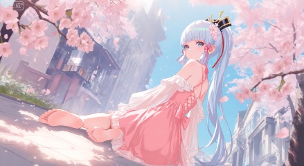 1girl, solo, long hair, looking at viewer, bangs, blue eyes, hair ornament, long sleeves, dress, ribbon, bare shoulders, sitting, blue hair, full body, hair ribbon, ass, flower, outdoors, barefoot, looking back, hair flower, blunt bangs, feet, tree, see-through, bare legs, cherry blossoms, pink dress, pink flower, branch, kamisato ayaka