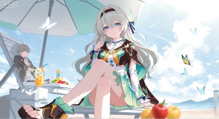 1girl, solo, long hair, breasts, looking at viewer, smile, bangs, blue eyes, skirt, sitting, closed mouth, swimsuit, bikini, thighs, hairband, outdoors, food, sky, day, sailor collar, cup, neckerchief, legs, toes, fruit, umbrella, chair, sandals, crossed legs, bug, butterfly, beach umbrella,firefly \(honkai: star rail\),jacket,white dress,long sleeves,white flower,headband,stelle \(honkai: star rail\),caelus \(honkai: star rail\)