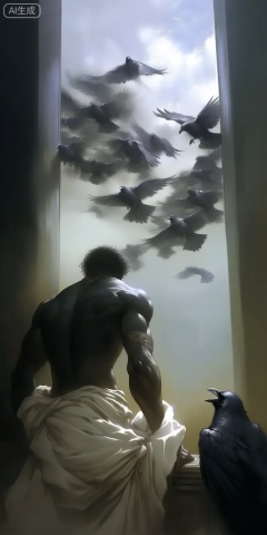a dramatic digital illustration shoot from a profile camera angle about a muscular man standing in front of a large window, looking out at a group of birds flying in the cloudy sky, the image also shows dramatic lighting and shadows, on the middle of the image, a muscular, dark-skinned man with curly hair appears to be standing with his back to the viewer, wearing a white cloth draped around his waist, he is facing away from the camera, with his upper body visible, to his right, two black crows are standing, one with its beak open and the other with its mouth open, looking up at the man, the mans muscular physique is highlighted by the dramatic lighting, which casts shadows on his body, the background is a misty, cloudy sky with a few birds flying around, adding to the dramatic atmosphere of the scene,